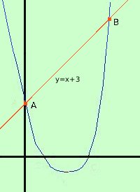 trovare le intersezioni fra la parabola y = x2 - 4x + 3 e la retta y = x + 3 devo fare il sistema fra le due curve ![]() y = x + 3 sostituisco il valore della y ricavato dalla prima nella seconda equazione; al posto della prima metto una linea ![]() x2 - 4x + 3 = x + 3 Conviene sostituire in modo che x2 sia positivo: cosi' non devi cambiare di segno ![]() x2 - 5x = 0 risolvo l'equazione di secondo grado: e' un'equazione spuria x2 - 5x = 0 x ( x - 5) = 0 ottengo le due soluzioni x = 0 x = 5 sostituisco il valore 0 in una delle due equazioni del sistema (conviene prendere la piu' semplice) ![]() y = x + 3 = 3 Primo punto A=(0, 3) sostituisco il valore 5 in una delle due equazioni del sistema ![]() ![]() y = x + 3 = 5 + 3 = 8 Secondo punto B=(5, 8) a destra la rappresentazione grafica |