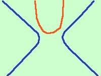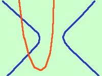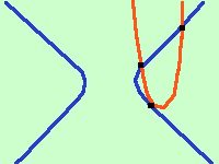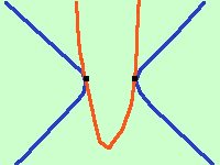 Disegnare le possibili intersezioni fra un'iperbole in forma canonica ed una parabola con asse verticale Distinguiamo nelle figure se le intersezioni reali sono fra la parabola e un solo ramo dell'iperbole oppure fra la parabola ed entrambe i rami dell'iperbole. Fissato questo passiamo a vedere quali sono le possibili soluzioni