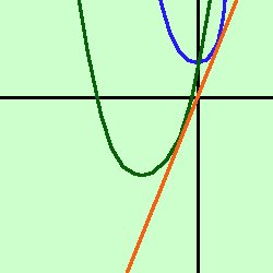 k2 + 4m + 4 -4 = 0Se non sei convinto dei segni del quadrato ferma il mouse sul risultato metto in ordine k2 + 4k = 0 E' un'equazione spuria k(k-4) = 0 Un prodotto e' zero se uno dei fattori e' zero, quindi avremo k=0 oppure (k+4)=0 ed abbiamo i due risultati k1 = 0 k2 = -4 Abbiamo quindi due parabole possibili tangenti alla retta data y= x2 - (0)x + 1 y= x2 + 1 y= x2 - (-4)x + 1 y= x2 + 4x + 1 A destra il grfico relativo: le due parabole sono una in blu e l'altra in verde scuro, mentre la retta y=2x e' in rosso |