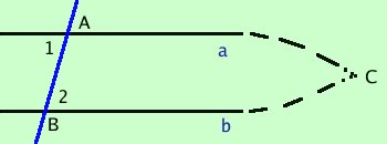 Supponiamo che le rette non siano parallele, cio' significa che, magari dopo qualche chilometro si incontreranno in un punto C (per questo ho messo il tratteggio). Cio' significa che si forma il triangolo CAB ed in questo triangolo l'angolo 1 e' esterno mentre l'angolo 2 e' interno non adiacente, quindi l'angolo 1 deve essere maggiore dell'angolo 2 contro l'ipotesi. Ho negato l'ipotesi quindi il criterio e' vero. D'ora in avanti per mostrare che due rette sono parallele bastera' mostrare che gli angoli alterni interni sono uguali Equivalentemente potrai mostrare anche che