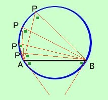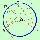 Conseguenza immediata del teorema sugli angoli al centro ed alla circonferenza e' che: Tutti gli angoli alla circonferenza che insistono sullo stesso arco sono congruenti infatti sono tutti congruenti alla meta' dello stesso angolo al centro inoltre anche l'angolo formato da AB con la tangente alla circonferenza in A ed in B e' un angolo alla circonferenza che insiste sull'arco AB Veramente l'angolo formato da AB con la tangente alla circonferenza e' la posizione limite dell'angolo alla circonferenza: