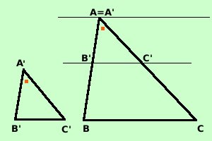 Traccio per A la retta parallela alla retta B'C'; siccome vale AB : A'B' = AC : A'C' per il teorema inverso del teorema di Talete la retta BC e' parallela alla retta B'C', ed avremo: BCA = B'C'A'^ ^ perche' angoli corrispondenti rispetto alle rette parallele B'C' e BC tagliate dalla trasversale AC ABC = A'B'C'^ ^ perche' angoli corrispondenti rispetto alle rette parallele B'C' e BC tagliate dalla trasversale AB Quindi i due triangoli hanno tutti e tre gli angoli uguali e per il primo criterio sono simili, come volevamo  |