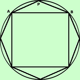 quadrato ma minore della lunghezza della circonferenza:Per mostrare che la misura ciconferenza e' maggiore ddella misura del perimetro di qualunque poligono inscritto basta ricordare che ogni corda e' minore del suo arco Prova a dimostrarlo per esercizio Se considero il lato del quadrato AB ed i lati dell'ottagono AP e PB essi formano il triangolo APB ed in ogni triangolo ogni lato e' minore della somma degli altri due, quindi AB < AP + PB applicandolo a tutti i lati del quadrato e dell'ottagono ottengo la proprieta' |