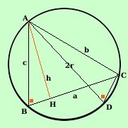 PoniamoBC = a___ AC = b___ AB = c___ Dimostrazione Considero l'altezza del triangolo ABC sul lato BC e la chiamo h AH = h___ Ora dal punto A traccio il diametro AD della circonferenza AD = 2r___ Congiungendo D con C ottengo il triangolo ADC Considero ora i triangoli ABH ed ADC essi hanno: AHB = ACD^^ perche' retti ABC = ADC^^ perche' angoli alla circonferenza che insistono sullo stesso arco AC: quindi i due triangoli sono simili per il primo criterio di similitudine e posso scrivere: AB : AD = AH : AC utilizzando le misure c : 2r = h : b