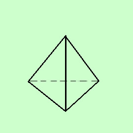 Consideriamo come figura base il triangolo equilatero e facciamo confluire, nello spazio, tre vertici di tre triangoli equilateri in un angoloide: l'angoloide misurera' quindi 180°; ripetendo la cvostruzione su un secondo vertice la figura si chiudera' ed otterremo un poliedro di 4 facce che avra' congruenti tutte le facce, i lati e gli angolidi: il Tetraedro regolareIl tetraedro regolare ha: 4 facce formate da triangoli equilateri congruenti 6 lati congruenti 4 angoloidi di 180° congruenti |