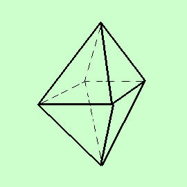 Consideriamo sempre come figura base il triangolo equilatero e facciamo confluire, nello spazio, quattro vertici di quattro triangoli equilateri in un angoloide: l'angoloide misurera' quindi 240°; i lati non in comune formeranno un poligono di 4 lati: se su ognuno di questi 4 lati poniamo un triangolo equilatero il solido si chiudera' ed otterremo un poliedro con 8 triangoli equilateri come facce e con 6 angolidi di 240° l'Ottaedro regolare L'ottaedro regolare ha: 8 facce formate da triangoli equilateri congruenti 12 lati congruenti 6 angoloidi di 240° congruenti |