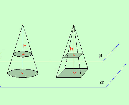 ![]() Anche per calcolare il volume del cono faremo semplicemente riferimento al principio di Cavalieri Se considero una piramide con la stessa altezza del cono e avente area di base uguale a quella del cono e se ogni piano Siccome il volume della piramide si trova moltiplicando l'area di base per l'altezza e dividendo il risultato per 3 avremo