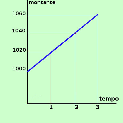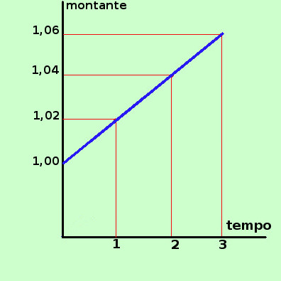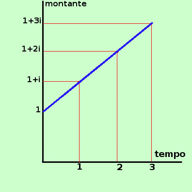 Consideriamo la formula del montante ad interesse semplice M = C (1+i t) Consideriamola come M = C + C i t Per semplicita' considero il capitale C costituito da 1 euro, cosi' possiamo toglierlo dalla formula. Per avere poi il risultato finale per un capitale C bastera' moltiplicare quello che otteniamo per C M = 1 + i t Se cosideriamo fisso il tasso i abbiamo che il montante I dipende dal tempo t e tale dipendenza puo' essere rappresentata in un piano cartesiano come una retta nel piano di equazione y = m x + 1 con y uguale al Montante I x uguale al tempo t ed m (coefficiente angolare) uguale a i Quindi e' possibile rappresentare graficamente come varia l'interesse al variare del tempo e la rappresentazione grafica e' sempre data da una retta passante per il punto (0;1) Siccome il tempo non puo' andare all'indietro allora noi cosidereremo solamente il tempo positivo e quindi la semiretta che parte dal punto (0:1) Per disegnare subito il grafico basta osservare che corisponde alla formula dell'interesse vista nella pagina precedente aumentata di 1, quindi basta spostare verso l'alto tutto il grafico di 1 quindi il grafico di I = i t e' dato da ![]() Al tempo 1 (dopo 1 anno) avremo il montante 1+i (se t=1 allora M = 1 + i·1 = 1+i) Al tempo 2 (dopo 2 anni) avremo il montante 1+2i (se t=2 allora M = 1 + i·2 = 1+2i) Al tempo 3 (dopo 3 anni) avremo il montante 1+3i (se t=3 allora M = 1 + i·3 = 1 + 3i) .......... Vediamo ora un esempio pratico Rappresentiamo graficamente l'interesse, sempre per un capitale di 1 euro impiegato al tasso del 2% (i = 0,02) ![]() Al tempo 1 (dopo 1 anno) avremo l'interesse 0,02 cioe' 2 centesimi (se t=1 allora I= 0,02·1 = 0,02€) Al tempo 2 (dopo 2 anni) avremo l'interesse 0,04 cioe' 4 centesimi (se t=2 allora I= 0,02·2 = 0,04€) Al tempo 3 (dopo 3 anni) avremo l'interesse 0,06 cioe' 6 centesimi (se t=3 allora I= 0,02·3 = 0,06€) .......... Da notare che per farti vedere meglio il grafico in verticale ho messo lo spazio fra l'origine ed 1 molto inferiore a quello che sarebbe effettivamente, come ti ho gia' detto puoi fare queste cose, se non danno luogo ad equivoci, per poter evidenziare al meglio le cartteristiche del grafico che rappresenti Se il capitale e' diverso da 1 euro si procede in questo modo Rappresentiamo graficamente il montante, per un capitale di 1000 euro impiegato al tasso del 2% (i = 0,02) ![]() Al tempo 1 (dopo 1 anno) avremo un montante di 1020 euro (se t=1 allora M = 1000·(1+0,02·1) = 1000·(1,02) = 1020,00€) Al tempo 2 (dopo 2 anni) avremo un montante di 40 euro (se t=2 allora M= 1000·(1+0,02·2) = 1000·(1+0,04) = 1000·1,04 = 1040,00€) Al tempo 3 (dopo 3 anni) avremo un montante di 60 euro (se t=3 allora M= 1000·(1+0,02·3) = 1000·(1+0,06) = 1000·1,06 = 1060,00€) .......... |