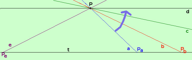 Continuando a ruotare vedo che il punto di intersezione si allontana verso destra finche' la retta diventa parallela ed il punto sparisce; ma basta che io ruoti ancora leggermete la retta parallela perche' il punto di intersezione ricompaia a sinistra: continuando a ruotare otterro' la retta e che taglia t in Pe