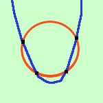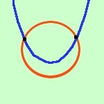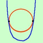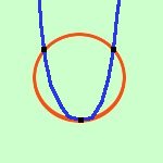 | Essendo le equazioni della parabola e della circonferenza entrambe di secondo grado, se facciamo il sistema per trovare i punti comuni otterremo come equazione risolvente un'equazione di quarto grado; Poiche' e' piuttosto complicato risolvere un'equazione di quarto grado, sono pochi i problemi in cui si parla di intersezioni fra parabola e circonferenza e, in questi, di solito, si tratta di equazioni particolari e semplici.Qualche esercizio sara' trattato fra gli esercizi di riepilogosulle coniche Comunque vediamo per esercizio quali sono i casi possibili Essendo l'equazione risolvente di quarto grado per il teorema fondamentale dell'algebra avremo 4 soluzioni che possono essere