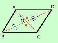 I due triangoli AOD e BOC sono congruenti per il primo criterio e quindi hanno congruenti tutti gli elementi; in particolare: essendo l'angolo ODA^ congruente all'angolo OBC^ ed essendo questi angoli alterni interni rispetto alle rette AD e BC tagliate dalla trasversale BD allora le due rette AD e BC saranno parallele Basta ora considerare i triangoli AOB e COD e ripetere lo stesso ragionamento per dimostrare il parallelismo fra le rette AB e CD come volevamo Avendo dimostrato sia il teorema diretto che quello inverso i due fatti, parallelogramma e lati opposti congruenti, saranno equivalenti |