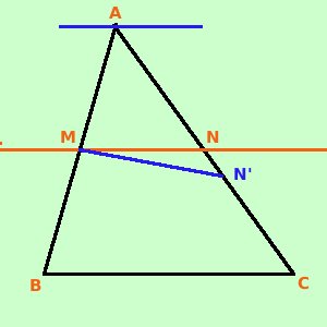 Applicando la proprieta' del comporre all'ipotesi posso scrivere (AM + MB) : MB = (AN + NC) : NC AB : MB = AC : NC Per assurdo neghiamo la tesi: supponiamo che MN non sia la parallela e sia invece MN' la parallela: allora per il teorema di Talete posso scrivere AB : MB = AC : NC' Ma per ipotesi vale AB : MB = AC : NC E per l'unicita' del quarto proporzionale deve essere NC' = NC quindi MN coincide con la parallela alla retta BC, come volevamo. Come esercizio vediamo in particolare cosa succede quando il punto in cui la retta taglia il lato e' il punto medio del lato stesso: In ogni triangolo la parallela ad un lato passante per il punto medio di un altro lato divide il terzo lato a meta' vale anche l' inverso: In ogni triangolo la congiungente i punti medi di due lati e' parallela al terzo lato