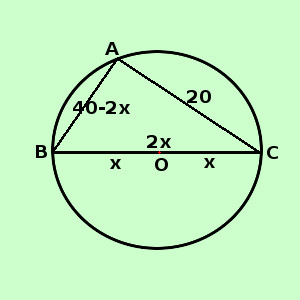 soluzione Risolvere il seguente problema La somma dell'ipotenusa e di un cateto di un triangolo rettangolo misura 40 cm. Sapendo che l'altro cateto misura 20 cm. determinare il raggio del cerchio circoscritto al triangolo ipotesi: il triangolo e' rettangolo la somma dell'ipotenusa e di un cateto misura 40 cm l'altro cateto misura 20 cm. tesi: trovare il raggio del cerchio circoscritto al triangolo ![]() Il teorema "di Dante" dice che il diametro del cerchio circoscritto corrisponde all'ipotenusa del triangolo rettangolo raggio del cerchio circoscritto = BO = OC = x ipotenusa = BC = 2x primo cateto = AB = 40 - BC = 40 - 2x secondo cateto = AC = 20 cm Applico il Teorema di Pitagora al triangolo AB2 + AC2 = BC2 (40 - 2x)2 + 202 = (2x)2 1600 - 160x + 4x2 + 400 = 4x2 4x2 - 4x2 - 160x = - 400 - 1600 - 160x = - 2000