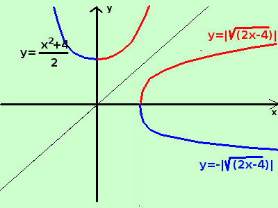 sviluppo Data la seguente espressione determinatene, se possibile, la funzione inversa indicandone anche le eventuali restrizioni nel dominio y = √(2x - 4) Il dominio dell'espressione, essendovi un radicale, e' dato dai valori che rendono il radicando positivo o nullo 2x - 4 ≥ 0 → x ≥ 2 quindi D = {x ∈ ℜ / x ≥ 2} E' una parabola orizzontale Non e' una funzione perche' ad ogni valore della x nel dominio (a parte il valore 2) corrispondono 2 valori per la y: ad esempio per x = 4 abbiamo y=±2 Possiamo scomporla in due funzioni, una con il radicale positivo e l'altra con il radicale negativo Per poterlo fare utilizziamo la definizione di modulo y = |√(2x - 4)| y = -|√(2x - 4)| ![]() y2 = 2x - 4 trovo quindi l'inversa scambiando fra loro la x e la y x2 = 2y - 4 esplicito la y