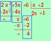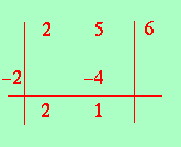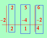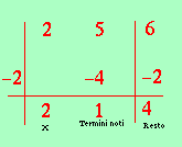![]() Consideriamo poi che quello che conta nella divisione e' il secondo termine del divisore (perche' il primo rimoltiplicato viene uguale e di segno contrario, quindi va via) e siccome quando ![]() Adesso inizio la divisione: abbasso il primo termine ![]() poi lo moltiplico per il numero a sinista e scrivo il risultato sotto il secondo termine (ma sopra la sbarra orizzontale) ![]() ora faccio la somma algebrica dei termini nella seconda colonna e scrivo il risultato sotto la sbarra. ![]() Ora ripeto: moltiplico il divisore per il numero ottenuto e scivo il risultato nella terza colonna sopra la sbarra ![]() Infine sommo in colonna e la divisione e' terminata. ![]() Se osservi le due figure successive e guardi i riquadri blu ti puoi rendere conto che la divisione e' la stessa fatta prima ![]() ![]() Ora su questo argomento e' bene fare molti esercizi esercizi |