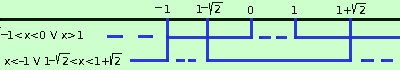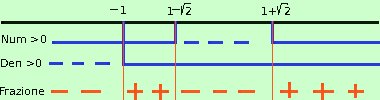 Se hai bisogno di un ripasso Numeratore: x2 - x - 1 > 0 Calcoli Denominatore: x + 1 >0 ottengo Numeratore positivo: x <1- ![]() ![]() Denominatore positivo: x > -1 Faccio il grafico indico i valori positivi con una linea continua ed indico i negativi con una linea tratteggiata: Per sapere il segno della frazione controllo i segni con la regola del prodotto (la regola dei segni e' la stessa per il prodotto ed il quoziente) ![]() ![]() ![]() ![]() Siccome cerco dove la frazione e' minore di zero ho come risultato: x < -1 V 1- ![]() ![]() Ora metto a sistema i due risultati ![]() x < -1 V 1- ![]() ![]() Faccio il grafico (e' un sistema quindi devo prendere le soluzioni comuni ad entrambe le disequazioni) ![]() Ottengo come risultato: 1- ![]() ![]() |