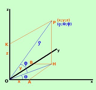 Facciamo un breve cenno sulle coordinate polari nello spazio ![]() Ho: OK = z OA = x OB = y Congiungo il punto P con l'origine degli assi O ed ottengo PO = ![]() ![]() ![]() ![]() ![]() Considero ora il triangolo rettangolo POH in esso avremo valide le relazioni: z = OK = PH = ![]() ![]() OH = ![]() ![]() ![]() e quindi per trovare x ed y, considerando il triangolo rattangolo OHA: x = OA = OH sen ![]() ![]() ![]() ![]() y = AB = AH = OH cos ![]() ![]() ![]() ![]() Quindi avremo le tre formule di trasformazione da coordinate cartesiane a coordinate polari