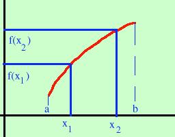 ![]() siccome siamo in un piano cartesiano diremo che e' crescente quando spostando il punto sulle x verso destra il punto sulle y si sposta verso l'alto in simboli: si dice che la funzione y = f(x) e' crescente nell' intervallo [a, b] se per tutti i punti dell'intervallo da x1 < x2 segue f(x1) < f(x2) cioe' se prendo un punto sulle x piu' a destra il punto sulle y e' piu' in alto, oppure man mano che la x aumenta anche la y cresce |
