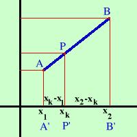 Conoscendo le coordinate di due punti nel piano e' possibile determinare le coordinate di un loro punto intermedio che divida il segmento secondo un rapporto assegnato m/n E' un argomento che solo molto raramente ho visto fare nelle scuole medie superiori Consideriamo i punti nel piano A = (x1, y1) B = (x2, y2) Inoltre chiamo P = (xk, yk) il punto che divide il segmento nel rapporto k=m/n AP m ---- = ---- PB n ![]() Per comodita' supponiamo che i punti si trovino nel primo quadrante, la formula che otterremo sara' comunque valida in tutto il piano Da A , B e P traccio le coordinate Sull'asse x le proiezioni saranno A' , B' e P' Poiche' P e' il punto fra A e B che divide il segmento nel rapporto m/n allora anche P' dividera' il segmento A' B' nello stesso rapporto ( Teorema di Talete). Quindi A'P' m ----- = ---- P'B' n Sostituendo le misure xk - x1 m -------- = --- x2 - xk n faccio il minimo comune multiplo (o equivalentemente moltiplico in croce) n(xk - x1) = m(x2 - xk) moltiplico nxk - nx1 = mx2 - mxk devo ricavare xk quindi porto i termini che lo contengono prima dell'uguale nxk + mxk = nx1 + mx2 raccolgo xk xk(n + m) = nx1 + mx2 risolvendo rispetto a xk trovo la formula finale nx1 + mx2 xk = ------------- n + m in modo equivalente trovero' la formula per la coordinata y ny1 + my2 yk = ------------- n + m vediamo un semplice esercizio |