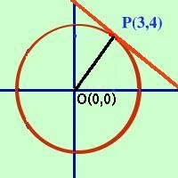 Vediamo anche un altro metodo che mi ha inviato Daniele: un visitatore del sito Si basa sul fatto che nella circonferenza la tangente in un suo punto e' perpendicolare al raggio nel punto di contatto; Come calcoli e' molto piu' semplice, ma ha il difetto di poter essere usato solo per la circonferenza e solo per la tangente ad un punto sulla circonferenza, mentre l'altro metodo e' generale e si puo' usare anche per tutte le coniche. Trovare l' equazione della tangente alla circonferenza ![]() condotte dal suo punto P(3,4) calcoliamo il coefficiente angolare della retta OP