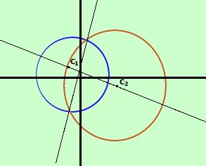 Calcolo l'asse radicale sottraendo fra loro le due equazioni membro a membro x2 + y2 + 4x -2y -20 =0 x2 + y2 -8x + 2y -28 = 0 ![]() 12x -4y + 8 = 0 Posso dividere per 4 ed ottengo l'equazione dell'asse radicale 3x -y + 2 = 0 Quindi, per trovare i punti comuni (punti base del fascio) risolvo il sistema ![]() x2 + y2 + 4x -2y -20 =0 Calcoli e trovo come risultato A(-2;-4) B(1;5) Troviamo ora i centri delle due circonferenze e, quindi, la retta dei centri