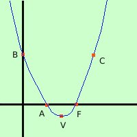 V = (3/2; -1/4) 2) troviamo l'intersezione D con l'asse y e' sufficiente prendere come prima coordinata 0 e come seconda coordinata il termine noto della parabola D = B = (0; 2) 3) troviamo le intersezioni E ed F con l'asse x, se esistono Devo fare il sistema fra la parabola e l'equazione dell'asse x (y=0) ![]() y = 0 sostituisco ![]() y = 0 ottengo le soluzioni calcoli ![]()