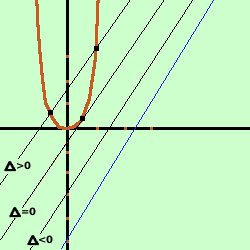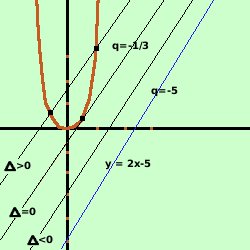 Considerate le rette parallele alla retta y = 2x - 5 determinare le condizioni per cui le intersezioni di tali rette con la parabola y = 3x2 siano rappresentate con valori reali e distinti ![]() Soluzione: Prima disegniamo la parabola e la retta date Osservando la figura vediamo che tracciando delle parallele alla retta data queste sono prima esterne, poi toccano la parabola e successivamkente hanno due punti di intersezione con la parabola; quindi