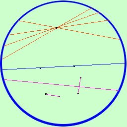 ![]() La figura, che richiama (indegnamente) un disegno di Escher, ti aiuta a capire? Man mano che ti avvicini al bordo c'e' sempre qualcos'altro Il piano di Klein e' un piano di questo genere in cui i punti si "addensano" man mano che ti avvicini al bordo; la retta sara' la congiungente due punti sul bordo ![]() Per un punto passano infinite rette Per due punti passa una sola retta La retta divide il piano in due parti tali che prendendo due punti dalla stessa parte il segmento che li unisce non taglia la retta, mentre prendendo due punti da parti opposte il segmento che li unisce taglia la retta ![]() |