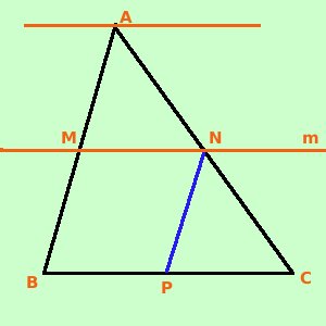 Dimostrazione: Essendo la retta m parallela a BC ho che due rette mi individuano un fascio di rette parallele (per indicarlo, in figura, ho messo la retta del fascio passante per A); vale il teorema di Talete quindi posso scrivere AM : MB = AN : NC Essendo AM = MB sono uguali i primi due termini della proporzione; avro' di conseguenza che sono uguali anche il terzo e quarto termine della proporzione, quindi: AN = NC cioe' N e' il punto medio del lato AB Potevo fare la costruzione mandando da N la parallela (in blu) al lato AB e quindi avrei ottenuto il punto P: punto medio del lato BC ![]() Dimostriamo ora l'inverso So che M e' il punto medio del lato AB: AM = MB inoltre N e' il punto medio del lato AC: AN = NC Devo dimostrare che la retta MN e' parallela a BC