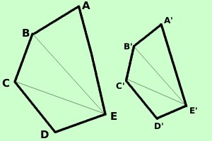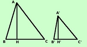 Vale il teorema: In poligoni simili le aree stanno tra loro come i quadrati dei rispettivi lati Cioe' se i due pentagoni ![]() sono simili allora posso scrivere anche Area (ABCDE) : Area(A'B'C'D'E') = (AB)2 : (A'B')2 Dimostrazione ![]() Essendo i triangoli simili posso scrivere la proporzione con le altezze (vedi pagina precedente) AB : A'B' = AH : A'H' Posso scrivere anche la proporzione (sempre valida) AB : A'B' = AB : A'B' Essendo le due proporzioni valide sara' valido anche il loro prodotto termine e termine (AB·AB) : (A'B'·A'B') = (AB·AH) : (A'B'·A'H') quindi, essendo AB·AH la doppia area di ABC e A'B'·A'H' la doppia area di A'B'C' avremo (AB)2 : (A'B')2 = 2 Area(ABC) : 2 Area(A'B'C') Dopo l'uguale ho una frazione e questa non cambia il suo valore se divido numeratore e denominatore per lo stesso numero; divido quindi per 2 (AB)2 : (A'B')2 = Area(ABC) : Area(A'B'C') Come volevamo |