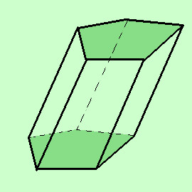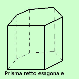 ![]() Da notare che, preso un prisma indefinito e presi due piani fra loro paralleli (e non paralleli alle rette generatrici del prisma), l'intersezione del prisma con i due piani paralleli individua due poligoni sempre congruenti fra loro che chiameremo sezioni parallele Definizione: Si dice prisma la parte di spazio racchiusa da un prisma indefinito compresa fra due sezioni parallele Chiameremo: le sezioni parallele basi del prisma le altre facce diverse dalle basi facce laterali (sono sempre parallelogrammi) i lati dei parallelogrammi non appartenenti alle basi si chiameranno spigoli laterali del prisma (sono tutti congruenti) la distanza fra i piani contenenti le basi altezza del prisma inoltre il tipo di poligono dara' il nome al prisma: nella nostra figura abbiamo un prisma pentagonale mentre nella pagina precedente avevamo un prisma quadrangolare Se gli spigoli laterali sono perpendicolari alle basi avremo un prisma retto; il prisma in figura, invece, e' obliquo Se poi i poligoni di base del prisma retto sono poligoni regolari diremo che il prisma e' regolare ![]() ![]() ![]() |