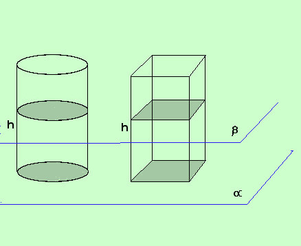 ![]() Per calcolare il volume faremo semplicemente riferimento al principio di Cavalieri Se considero un parallelepipedo rettangolo con la stessa altezza del cilindro e avente area di base uguale a quella del cilindro e se ogni piano ![]() ![]() Siccome il volume del parallelepipedo si trova moltiplicando l'area di base per l'altezza avremo