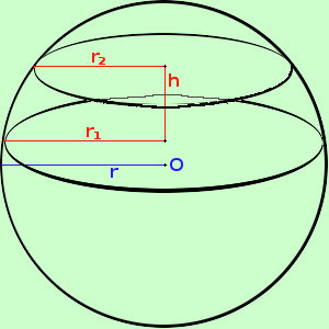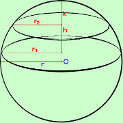 Da notare anche qua che nella formula compare solamente il raggio r della sfera e non intervengono i raggi r1 ed r2 delle circonferenze di base della zona ![]() allora basta fare la differenza fra le superfici delle calotte di base r1 ed r2; Chiamato k il segmento prolungamento da h fino alla superficie sferica avremo Area calotta con base raggio r1 = 2 π r (h+k) Area calotta con base raggio r2 = 2 π r k faccio la differenza Area zona sferica = 2 π r(h+k) - 2 π rk = 2 π rh + 2π rk - 2 π rk = 2 π rh Come volevamo |