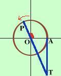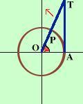 ![]() Dobbiamo immaginare che il raggio OP parta dall'orizzontale OA e che il punto P percorra la circonferenza Leggiamo il valore del segmento AT sulla verticale Per vedere quanto vale prendiamo angoli molto vicini al valore considerato e controlliamo sul grafico il valore di OH