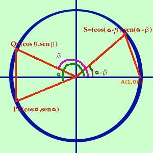 ![]() ![]() Consideriamo un cerchio trigonometrico. Consideriamo l'angolo α nel terzo quadrante e l'angolo β nel secondo quadrante tali che la loro differenza, (α - β), sia un angolo del primo quadrante. ![]() P=(cos α , sen α ) Q=(cos β , sen β ) S=( cos( α - β ) , sen( α - β ) ) A=( 1,0 ) L'arco PQ sara'uguale all'arco AS perche' gli angoli al centro sono entrambe uguali ad (α - β) quindi avremo che anche per le corde PQ = AS applicando la formula per la distanza fra due punti nel piano per calcolare sia PQ che AS avremo PQ = ![]() AS = ![]() uguaglio le due espressioni √[(cos α -cos β )2 + (sen α - sen β )2] = √{( [cos ( α - β )] - 1)2 + [sen ( α - β )] 2} Eseguiamo i calcoli: io faccio tutti i passaggi, tu puoi abbreviare tolgo le radici prima e dopo l'uguale (cos α -cos β )2 + (sen α - sen β )2 = ( [cos α - β ] - 1)2 + [sen α - β )]2 Eseguo i quadrati cos2 α + cos 2 β -2cos α cos β + sen2 α + sen2 β -2 sen α sen β = = cos2 (α - β) + 1 - 2 cos (α - β) + sen2 (α - β) Per la prima relazione fondamentale so che cos2(angolo) + sen2(angolo) = 1 , quindi 1 + 1 -2cos α cos β -2 sen α sen β = 1 + 1 - 2 cos (α - β) gli 1 si eliminano essendo di segno uguale da parti opposte dell'uguale -2 cos α cos β -2 sen α sen β = - 2 cos (α - β) sposto i termini dalla parte dell'uguale dove sono positivi 2 cos (α - β) = 2 cos α cos β + 2 sen α sen β divido tutto per 2 ed ottengo la prima formula
