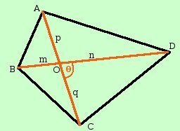 ![]() Chiamiamo O l'intersezione delle due diagonali e poniamo AC __ = d1 BD __ = d2 Poniamo inoltre AO __ = p OC __ = q BO __ = m OD __ = n BOA ^ = COD ^ = ![]() AOD ^ = BOC ^ = 180° - ![]() Per trovare l'area totale facciamo la somma delle areee dei vari triangoli componenti il quadrilatero As(ABCD) = As(AOB) + As(BOC) +As(COD) + As(DOA) Utilizziamo per trovare l'area dei triangoli la formula trovata all'inizio del capitolo As(ABCD) = =1/2pm sen ![]() ![]() ![]() ![]() Ricordando che sen (180° - ![]() ![]() As(ABCD) = 1/2pm sen ![]() ![]() ![]() ![]() Prima metto in evidenza i fattori comuni As(ABCD) = 1/2 sen ![]() Dentro parentesi posso raccogliere a fattor comune parziale = 1/2 sen ![]() = 1/2 sen ![]() Essendo p + q = d1 e m + n = d2 otteniamo la formula finale As(ABCD) = 1/2 d1 d2 sen ![]() Cioe'