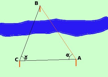 ![]() Supponiamo di voler calcolare la distanza fra due punti A e B: io mi trovo in A ma non posso raggiungere B perche' e' al di la' del fiume Possiamo spostarmi in un punto C e calcolare la distanza AC ed inoltre gli angoli ACB e CAB Abbiamo quindi il triangolo ABC in cui conosciamo due angoli ed i l lato compreso, quindi per risolvere il triangolo possiamo calcolare il terzo angolo ![]() ![]() ![]() ![]() e poi applicare il teorema dei seni
