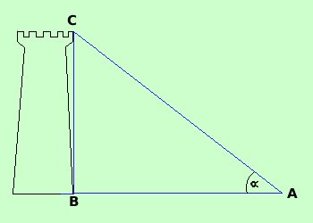 Piede della torre sul piano dell'osservatore ed accessibile ![]() In questo caso il problema si presenta in modo piuttosto semplice Spostandoci dalla base A della torre ad un punto B calcoliamo la distanza AB e consideriamo il triangolo rettangolo ABC Calcoliamo poi l'angolo ![]() Per la proprieta' dei triangoli rettangoli ho BC = AB tang ![]() Come volevamo Esercizio supponiamo di spostarci dal punto B di 30 metri AB = 30 m e che l'angolo ![]() e quindi ho BC = AB tang ![]() Naturalmente possiamo approssimare ad una cifra decimale perche' la nostra misura certamente non e' esatta al centimetro: in queste misure un'approssimazione al decimetro e' un buon risultato BC = 35,8 m |