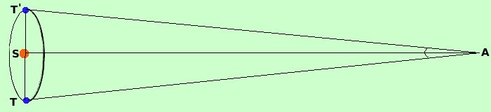 ![]() Ora possiamo usare la distanza Terra-Sole trovata per costruire un'unita' di misura astronomica: il Parsec (o parallasse secondo) Consideriamo un giorno dell'anno e poi consideriamo il giorno che cade sei mesi dopo avremo che la terra si trova in punti opposti T e T' rispetto alla sua orbita attorno al sole (l'orbita e' quasi circolare). Se osserviamo la stella alfa del centauro vediamo che tra sei mesi prima e sei mesi dopo notiamo una differenza di posizione: poco piu' di un secondo di grado questo sara' dovuto al fatto che, procedendo la terra nella sua orbita, dopo sei mesi sembrera' che la stella si sia mossa sulla sfera celeste; essendo la stella fissa la variazione e' dovuta all'orbita terrestre quindi possiamo considerare il triangolo TT'A dato dalle due posizioni della terra e con un angolo di un secondo di grado per definira una unita' di misura Al solito dovrei fare un triangolo lunghissimo e stretto, perche' l'angolo A sia di un secondo di grado, ma cio' e' graficamente impossibile, quindi la figura e' solamente per capire il ragionamento In astronomia si definisce parallasse l'angolo secondo cui da un punto si vede il diametro dell'orbita della terra attorno al sole Definizione Parsec (o Parallasse secondo) e' la distanza di un oggetto da cui si vede il diametro dell'orbita della terra attorno al sole con l'angolo di un secondo di grado Oggi come oggi il Parsec non si usa piu', sostituito dall'anno-luce Siccome la luce viaggia nel vuoto sempre con velocita' costante di 299.998 Km al secondo un anno luce vale 299.998Km · 60 sec · 60 minuti · 24 ore · 364 giorni = 9.434.817.100.800 Km Abbiamo che 1 parsec ~ 3,26 anni luce |