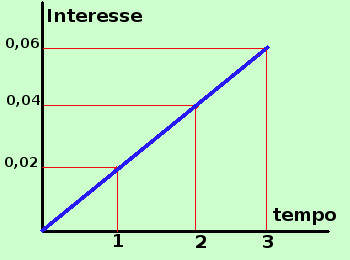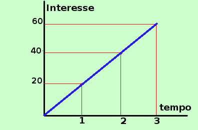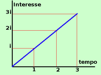 Consideriamo la formula dell'interesse semplice I = C i t Per semplicita' considero il capitale C costituito da 1 euro, cosi' possiamo toglierlo dalla formula. Per avere poi il risultato finale per un capitale C bastera' moltiplicare quello che otteniamo per C I = i t Se cosideriamo fisso il tasso i abbiamo che l'interesse I dipende dal tempo t cioe' l'interesse e' funzione lineare del tempo (cioe' piu' tempo impiego il capitale e maggiore e' l'interesse, se raddoppio il tempo raddoppia l'interesse, se triplico il tempo triplica l'interesse,...) Esiste quindi una proporzionalita' diretta fra il tempo e l'interesse e tale proporzionaita' puo' essere rappresentata in un piano cartesiano come una retta passante per l'origine di equazione y = m x con y uguale all'interesse I x uguale al tempo t ed m (coefficiente angolare) uguale a i Quindi e' possibile rappresentare graficamente come varia l'interesse al variare del tempo e la rappresentazione grafica e' sempre data da una retta passante per l'origine Siccome il tempo non puo' andare all'indietro allora noi cosidereremo solamente il tempo positivo e quindi la semiretta che parte dall'origine quindi il grafico di I = i t e' dato da ![]() Al tempo 1 (dopo 1 anno) avremo l'interesse i (se t=1 allora I= i·1 = i) Al tempo 2 (dopo 2 anni) avremo l'interesse 2i (se t=2 allora I= i·2 = 2i) Al tempo 3 (dopo 3 anni) avremo l'interesse 3i (se t=3 allora I= i·3 = 3i) .......... Avevamo detto che l'interesse semplice viene usato per periodi inferiori all'anno e il perche' lo vedremo piu' avanti, ma per ora consideriamolo valido anche per periodi superiori all'anno Vediamo ora un esempio pratico Rappresentiamo graficamente l'interesse, sempre per un capitale di 1 euro impiegato al tasso del 2% (i = 0,02) ![]() Al tempo 1 (dopo 1 anno) avremo l'interesse 0,02 cioe' 2 centesimi (se t=1 allora I= 0,02·1 = 0,02€) Al tempo 2 (dopo 2 anni) avremo l'interesse 0,04 cioe' 4 centesimi (se t=2 allora I= 0,02·2 = 0,04€) Al tempo 3 (dopo 3 anni) avremo l'interesse 0,06 cioe' 6 centesimi (se t=3 allora I= 0,02·3 = 0,06€) .......... Da notare che abbiamo usato un grafico con due scale diverse per l'orizzontale e la verticale, questo devi sempre farlo per poter evidenziare al meglio le cartteristiche del grafico che rappresenti Se il capitale e' diverso da 1 euro si procede in questo modo Rappresentiamo graficamente l'interesse, per un capitale di 1000 euro impiegato al tasso del 2% (i = 0,02) ![]() Al tempo 1 (dopo 1 anno) avremo 20 euro (se t=1 allora I= 1000·0,02·1 = 20,00€) Al tempo 2 (dopo 2 anni) avremo 40 euro (se t=2 allora I= 1000·0,02·2 = 40,00€) Al tempo 3 (dopo 3 anni) avremo 60 euro (se t=3 allora I= 1000·0,02·3 = 60,00€) .......... |