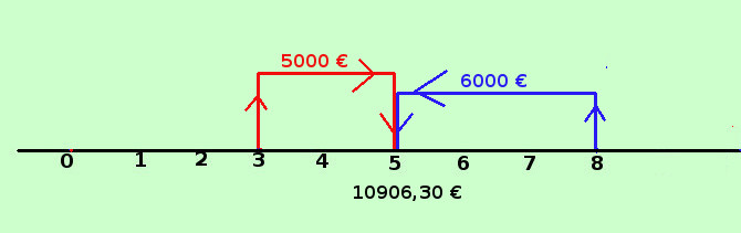 In questo caso ci riferiamo ad una scadenza compresa fra le varie scadenze delle somme considerate Dobbiamo determinare l'importo: vediamo come procedere su un esempio Devo ricevere da due debitori le somme di 5000 € fra 3 anni e 6000 € fra 8 anni Mi accordo con una banca per cederle i crediti concordando di ricevere una somma fra 5 anni al tasso del 1,25% Quanto ricevero' dalla banca fra 5 anni? Dati: credito1 = 5000 tempo1= 3 anni credito2 = 6000 tempo2= 8 anni tasso di sconto = 1,25% = 0,0125 tempo3 = 5 anni trovare il valore a 5 anni, chiamiamolo V5 Traccio la retta dei tempi ![]() V3 = 5000,00 · u2 + 6000,00 · v3 = 5000,00 · 1,01252 + 6000,00 · 1,0125-3= Leggo sulle tavole finanziarie i valori per un e vn 1.01252 = 1,02515625 1.0125-3 = 0,96341833 = 5000,00 ·1,02515625 + 6000,00 · 0,96341833 = 10906,29123 approssimo a 10906,30 € Quindi la banca in cambio dei miei crediti mi paghera' fra 5 anni l'importo di € 10906,30 Ho eseguito l'esercizio con due crediti, avrei potuto farlo con crediti e debiti assieme ed anche con 3,4,... crediti/debiti bastera' semplicemente sommare piu' termini |