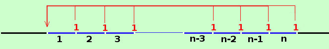 Consideriamo la rata fissa dell'importo di 1 €; per qualunque altro importo bastera' poi moltiplicare tale importo per il nostro risultato Consideriamo sulla retta dei tempi una rendita immediata posticipata di rata 1 € e di durata n anni ![]() i numeri sotto la retta indicano i periodi: essendo posticipata la rata e' pagata alla fine del periodo Il primo euro sara' versato alla fine del primo periodo e dovra' essere spostato indietro nel tempo per 1 periodo quindi alla fine avra' valore 1·(1+i)-1€ = v Il secondo euro sara' versato alla fine del secondo periodo e dovra' essere spostato indietro nel tempo per 2 periodi quindi alla fine avra' valore 1·(1+i)-2€ = v2 Il terzo euro sara' versato alla fine del terzo periodo e dovra' essere spostato indietro nel tempo per 3 periodi quindi alla fine avra' valore 1·(1+i)-3€ = v3 ............................... ............................... Il quartultimo euro sara' versato alla fine del quartultimo periodo e dovra' essere spostato indietro nel tempo per n-3 periodi quindi alla fine avra' valore 1·(1+i)-(n-3)€ = vn-3 Il terzultimo euro sara' versato alla fine del terzultimo periodo e dovra' essere spostato indietro nel tempo per n-2 periodi quindi alla fine avra' valore 1·(1+i)-(n-2)€ = vn-2 Il penultimo euro sara' versato alla fine del penultimo periodo e dovra' essere spostato indietro nel tempo per n-1 periodi quindi alla fine avra' valore 1·(1+i)-(n-1)€ = vn-1 L'ultimo euro sara' versato alla fine dell'ultimo periodo e dovra' essere spostato indietro nel tempo per n periodi quindi alla fine avra' valore 1·(1+i)-n€ = vn per semplificare alla fine ho sottointeso gli € Raccogliendo per calcolare il montante dovremo eseguire la somma ![]() Tra tutti i termini metto in evidenza v ![]() Si vede ora che, dentro parentesi si tratta di una progressione geometrica di n termini di ragione v e quindi, applicando la formula della somma essendo la ragione v minore di 1 utilizzo la seconda formula