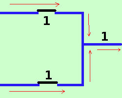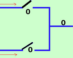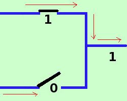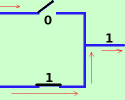 La somma in un'algebra di Boole puo' essere pensata come una coppia di interruttori in parallelo, cioe' tali che la corrente possa percorrere il primo ed il secondo cammino prima di ricongiungersi ![]() infatti indicando con 1 il passaggio di corrente e con 0 il non passaggio avremo