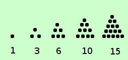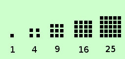 sono quei numeri che possiamo chiamare triangolari, quadratici,...nel piano; cubici nello spazio... eccetera ![]() Definiamo triangolare un numero come un quelli che vedete a destra , cioe' tale che, considerato come insieme di unita', posso disporre tali unita' in modo che la figura sia corrispondente ad un triangolo equilatero se consideriamo tali numeri possiamo indicare la successione 1, 3, 6, 10, 15,... an-1+n, an+(n+1), ...... Cioe' ogni termine successivo si ottiene aggiungendo al termine precedente tante unita' quant'e'il posto del termine che cerco: ad esempio 1 e' il primo termine, per avere il secondo termine devo fare 1+2 3 e' il secondo termine, per avere il terzo termine devo fare 3+3 6 e' il terzo termine, per avere il quarto termine devo fare 6+4 10 e' il quarto termine, per avere il quinto termine devo fare 10+5 15 e' il quinto termine, per avere il sesto termine devo fare 15+6 ................... E' una successione a:N→N divergente ![]() Similmente possiamo considerare i numeri "quadratici" Definiamo numero quadratico un numero come un quelli che vedete a destra , cioe' che considerato come insieme di unita' posso disporre tali unita' in modo che la figura sia corrispondente ad un quadrato se consideriamo tali numeri possiamo indicare la successione 1, 4, 9, 16, 25,... n2, (n+1)2 , ...... abbiamo gia' visto questa successione quando abbiamo considerato le potenze a base variabile Possiamo anche passare allo spazio e considerare la successione dei cubi dei numeri naturali, anche questa gia' considerata assieme alla precedente 1, 8, 27, 64, 125,... n3, (n+1)3 , ...... o per estensione le potenze quarte, quinte..... eccetera, ma di solito vengono considerate come semplici successioni di potenze senza dar loro particolare importanza |